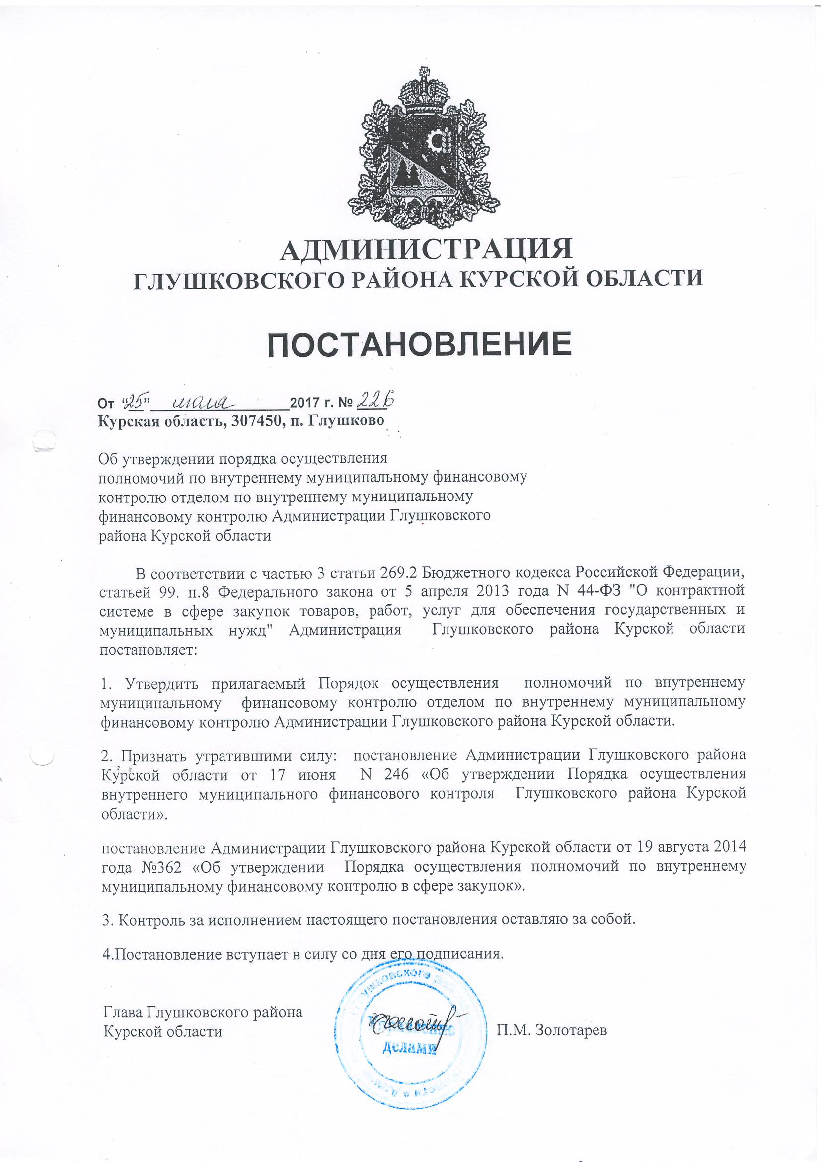 Постановление Администрации Глушковского района №226 от 25.07.2017 г. Об утверждении порядка осуществления полномочий по внутреннему муниципальному финансовому контролю отделом по внутреннему муниципальному финансовому контролю Администрации Глушковского района Курской области